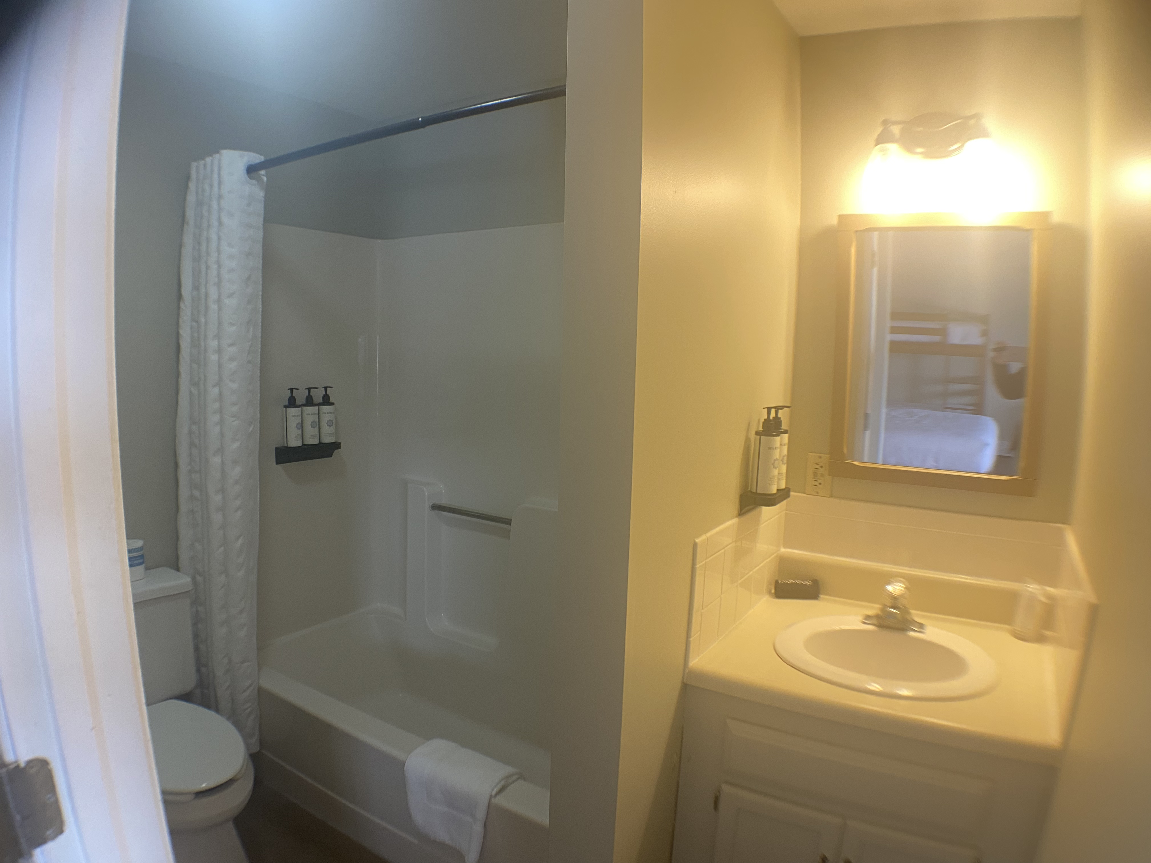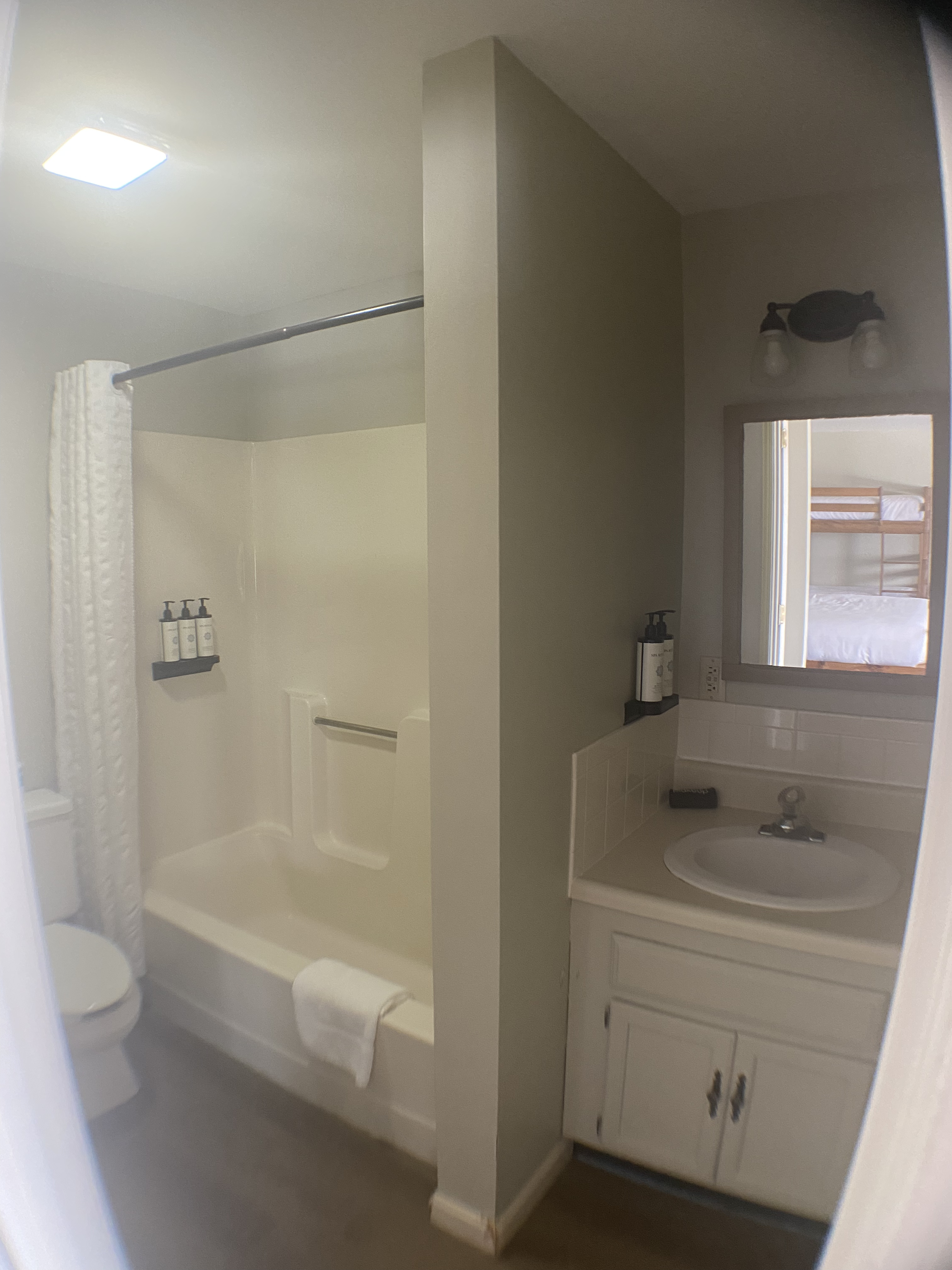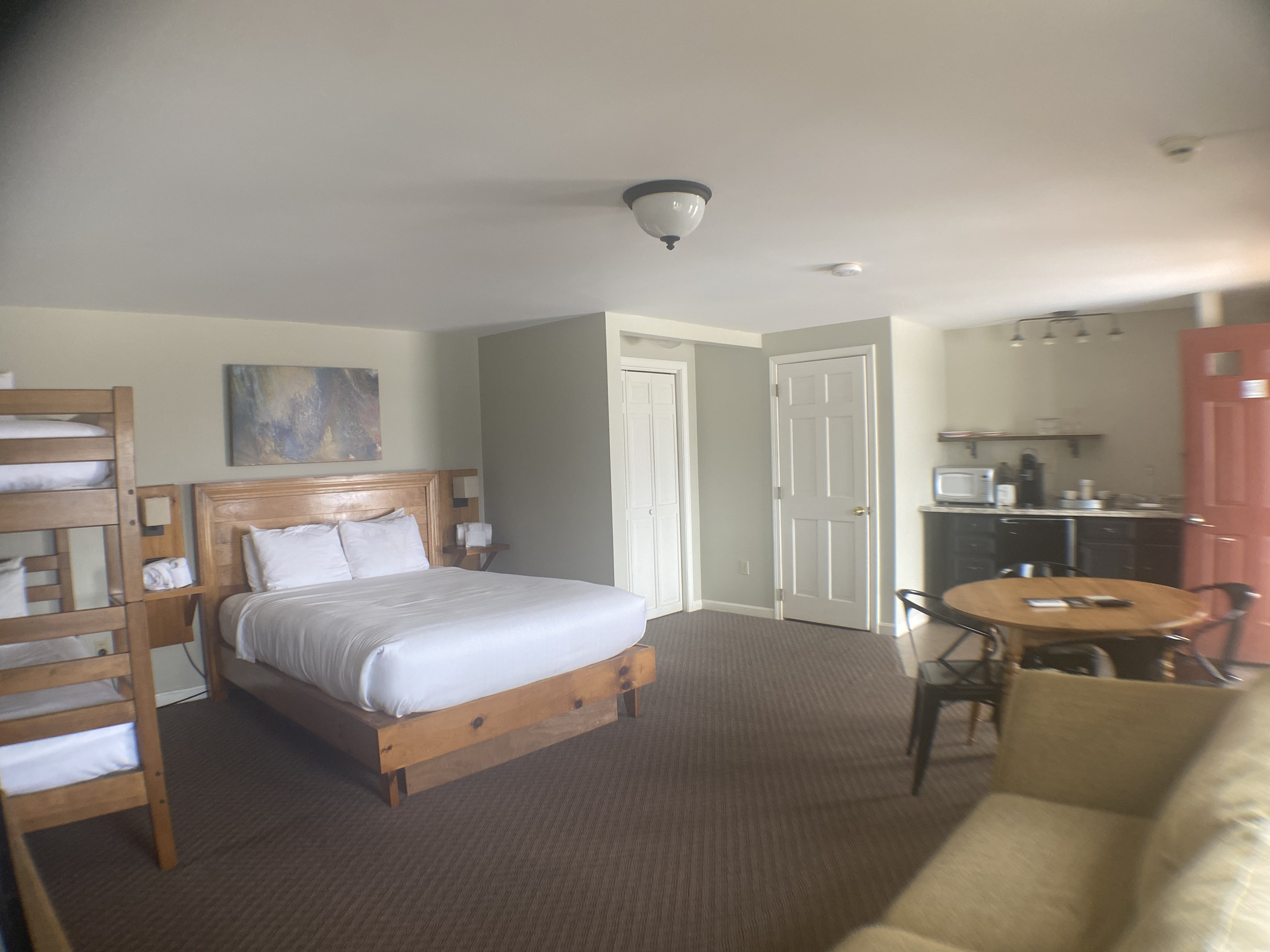Indulge in the simplicity and functionality of this space, where thoughtful design meets comfort. This well-appointed space includes a queen bed, bunk bed, a convenient kitchenette, a cozy dining/sitting area, and a bathroom with a tub/shower, ensuring all your needs are met in a single, inviting setting.