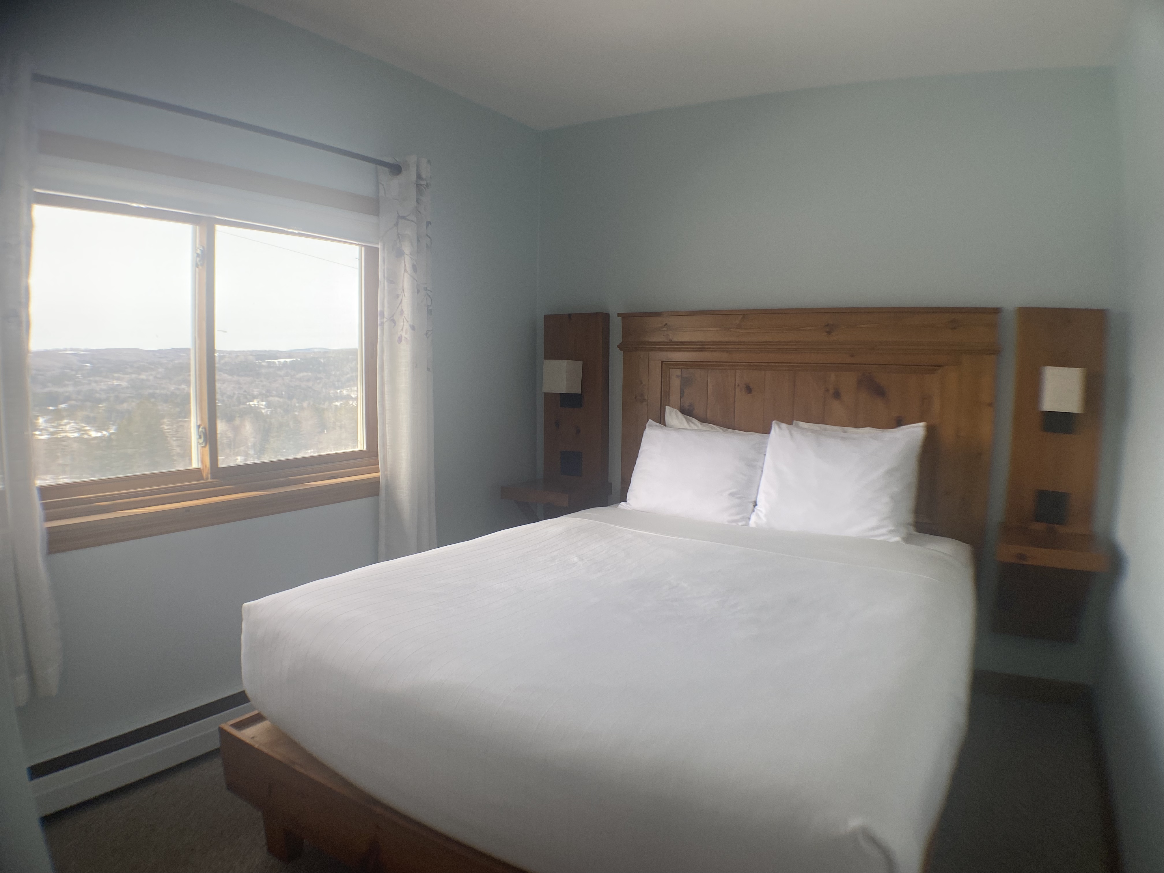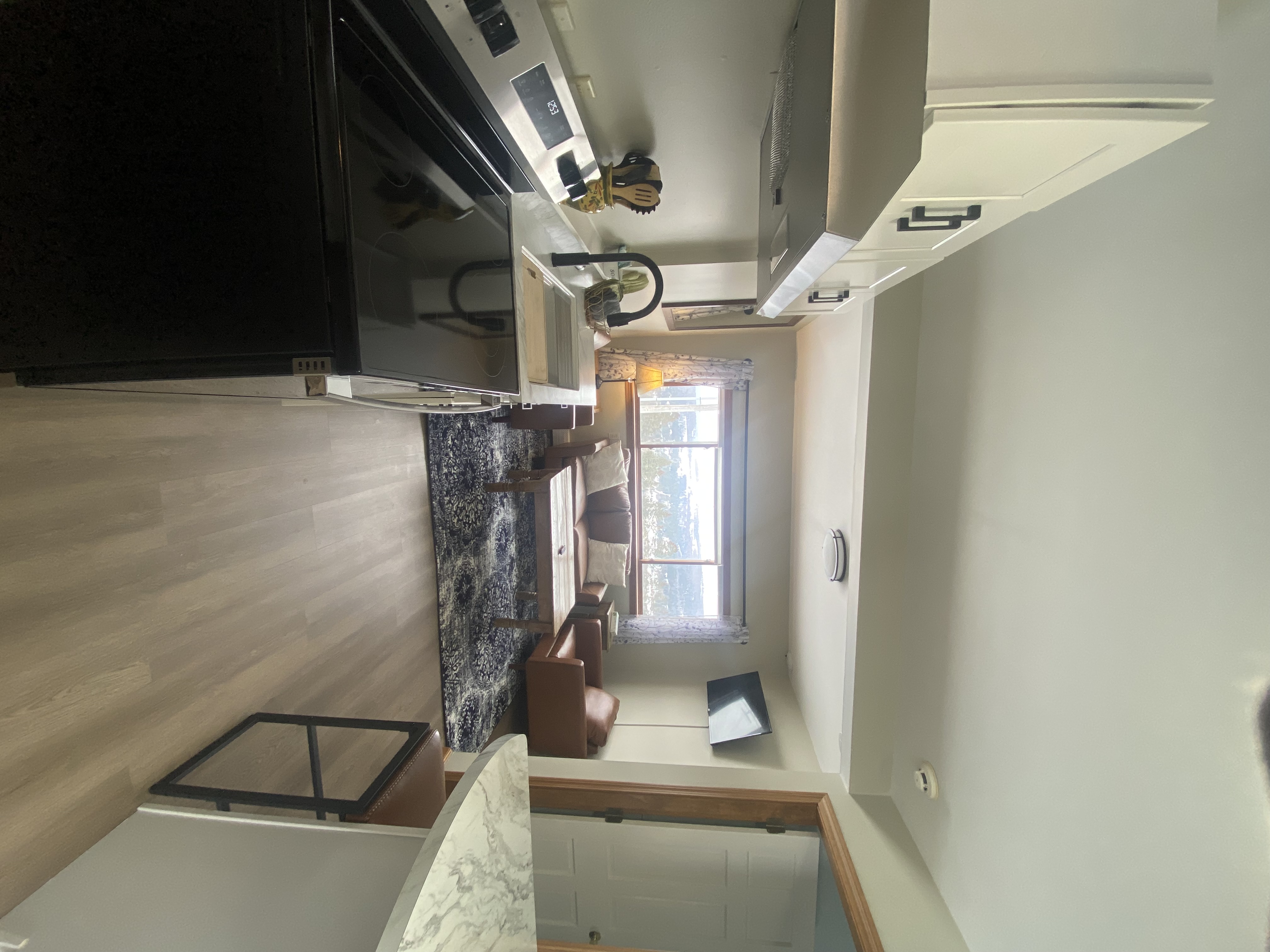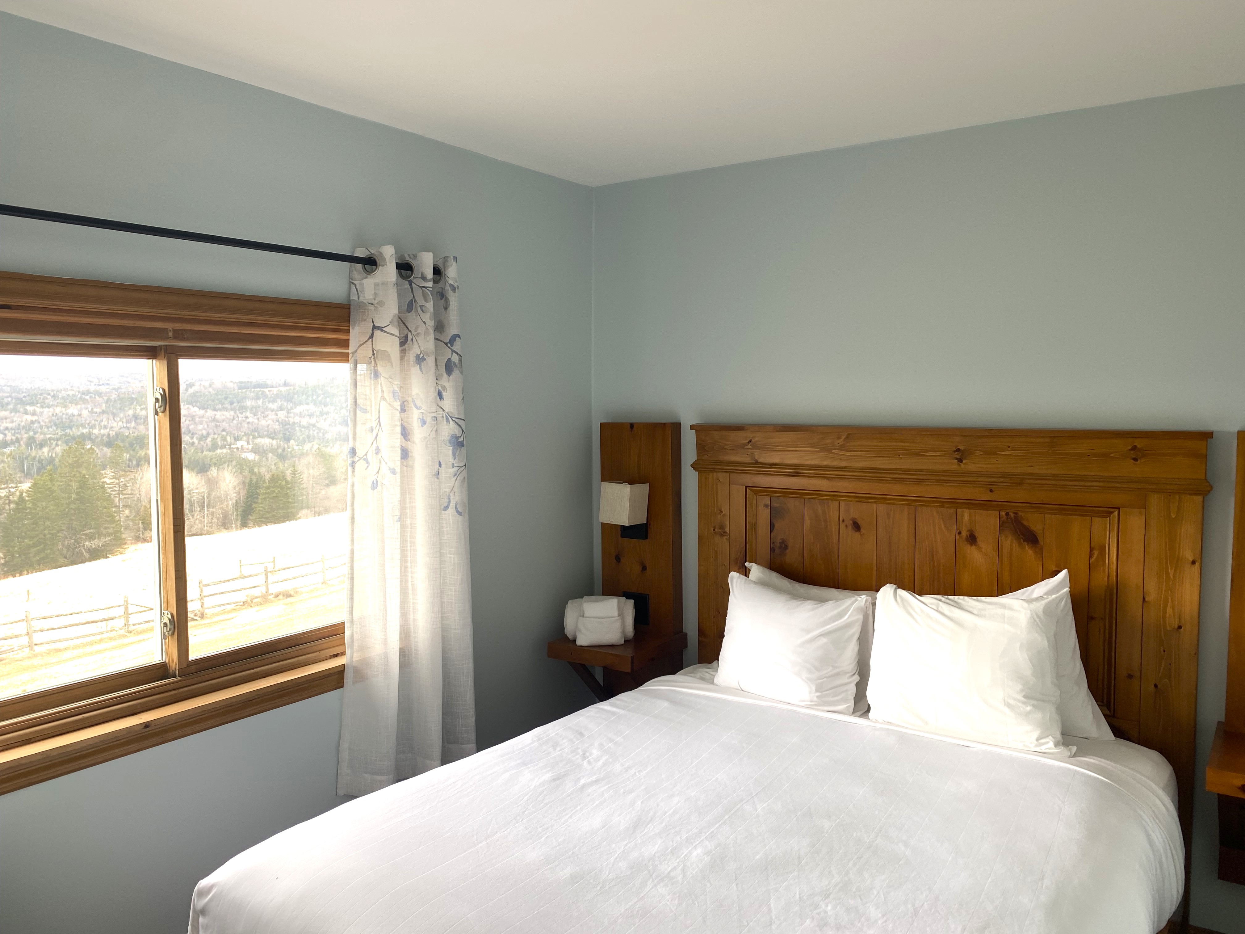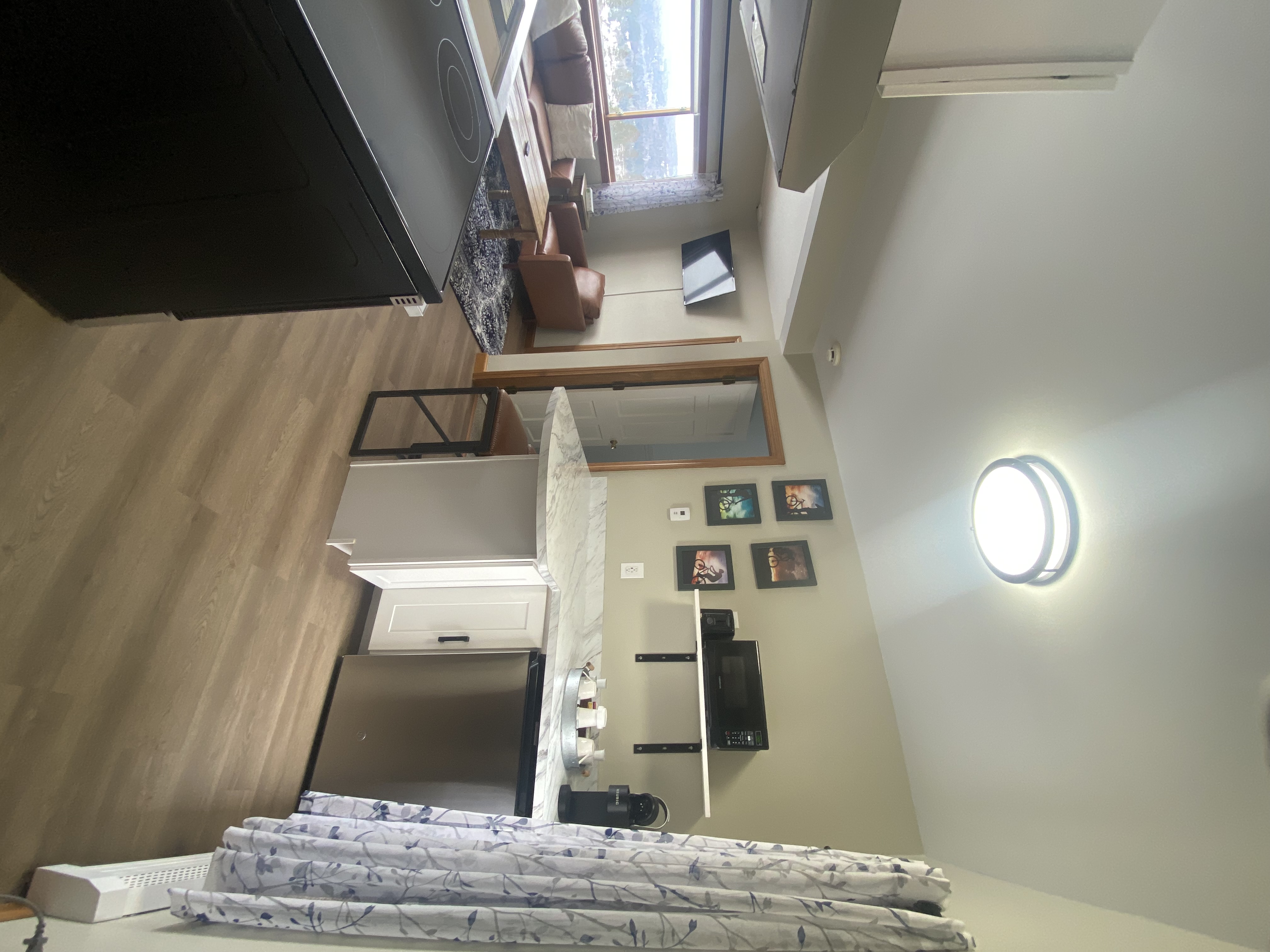The living and dining area provides a relaxed gathering space with a Roku TV and the suite now includes a full kitchen, making it ideal for extended visits or anyone who enjoys the ease of cooking and settling in. After a day exploring the Northeast Kingdom, return to a space that feels both functional and welcoming.