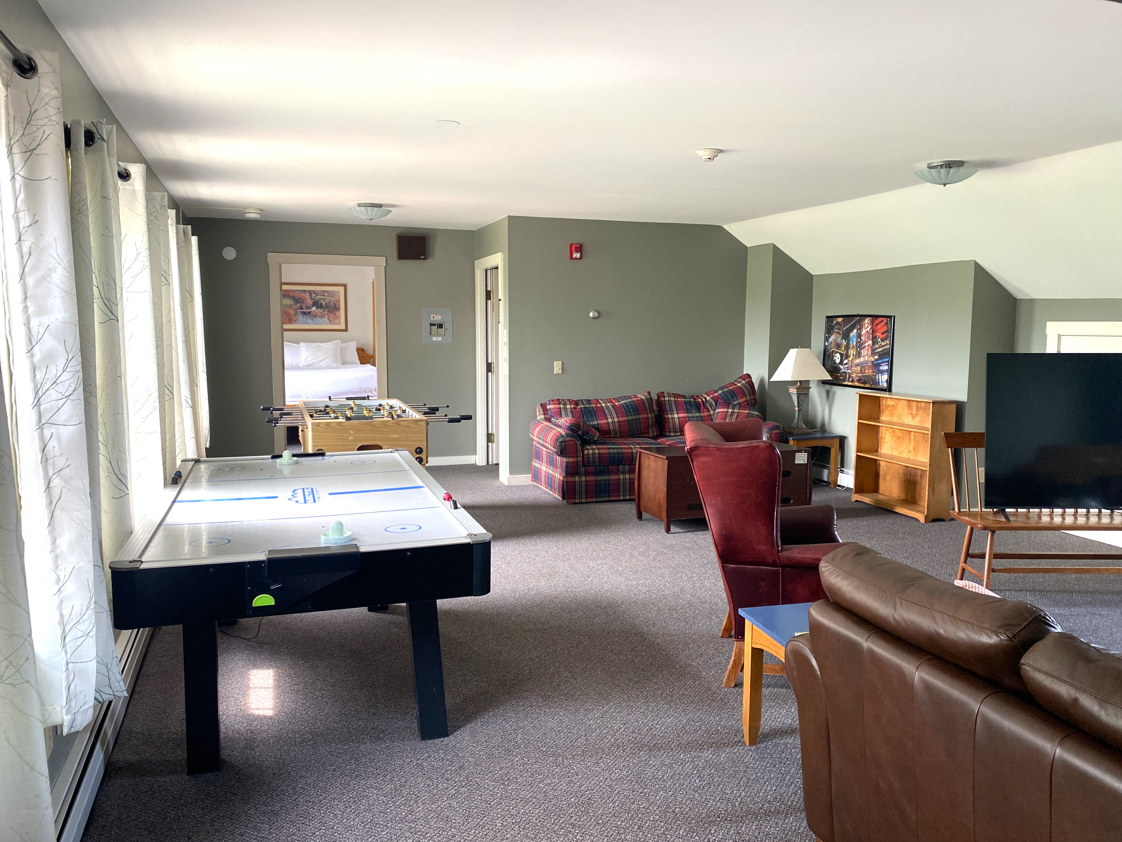 The fun continues in the game room, featuring air hockey, foosball, and a flat-screen TV, creating a lively space for both kids and adults to enjoy.